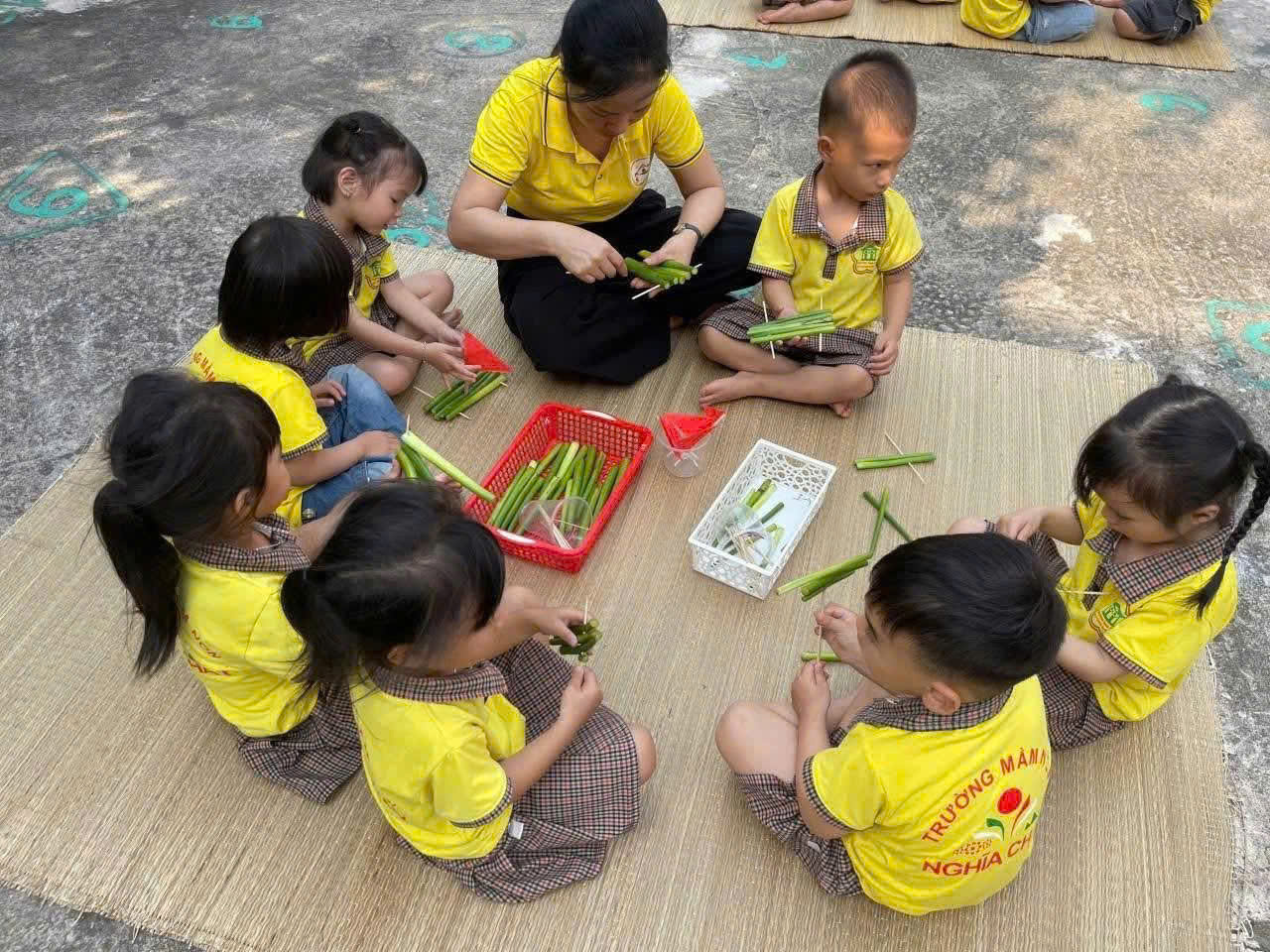 Dưới sự hướng dẫn tận tình của cô, trẻ được học cách xếp, buộc và ghép các vật liệu lại với nhau để tạo thành một chiếc bè có thể nổi trên mặt nước. Khi những chiếc bè hoàn thành và được thả vào chậu nước, các bé vô cùng hào hứng quan sát xem bè của mình có nổi được hay không.