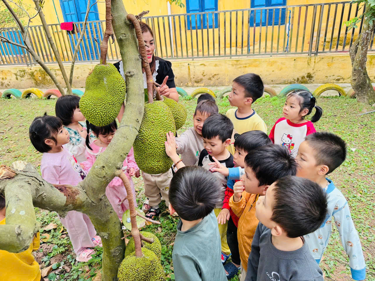 Trong không khí trong lành, các bé được cô giáo dẫn đi tham quan khu vườn với nhiều loại cây ăn quả quen thuộc như: cây bưởi, cây ổi, cây chuối, cây xoài… Tại đây, trẻ được quan sát trực tiếp đặc điểm của từng loại cây, nhận biết màu sắc, hình dáng của lá, hoa và quả. Các bé vô cùng thích thú khi tận mắt nhìn thấy những chùm quả chín và được nghe cô giáo giới thiệu về cách chăm sóc cây.